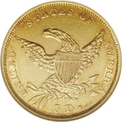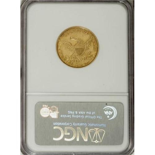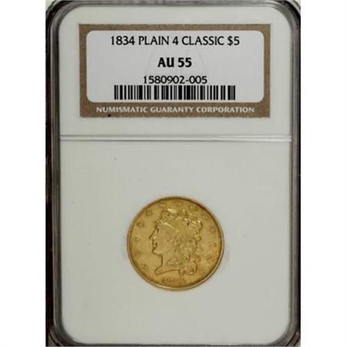 <B>1834 $5 Plain 4 AU55 NGC.</B></I> Second Head, Breen-6502, McCloskey 2-C, R.4. A lesser seen die marriage that can be recognized by a triple punched 4 in the date and the 5 in the denomination being completely left of the arrow feather. As normally seen on McCloskey 2-C, a heavy die crack connects NITED on the reverse. Lustrous and very well struck except for localized softness on the curls over Liberty's ear.<BR><BR><BR><B>Coin Engraver:</B> William Kneass<BR><BR><b>Shipping:</b> Coins & Currency (<a target="_blank" href="http://www.heritageauctions.com/common/shipping.php">view shipping information</a>\)