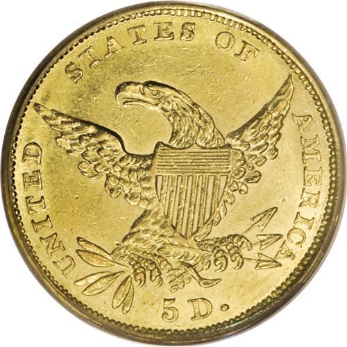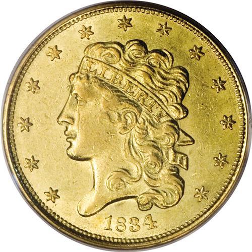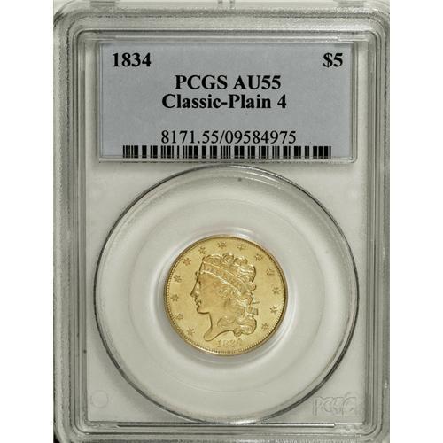 <B>1834 $5 Plain 4 AU55 PCGS.</B></I> First Head, Breen-6501, McCloskey 3-A, R.3. A boldly struck example that has no shortage of mint luster and only a single relevant mark, found between obverse stars 4 and 5. Lightly worn above Liberty's ear. A vertical die break beneath the eye makes Liberty appear to be crying.<BR><BR><b>Shipping:</b> Coins & Currency (<a target="_blank" href="http://www.heritageauctions.com/common/shipping.php">view shipping information</a>)
