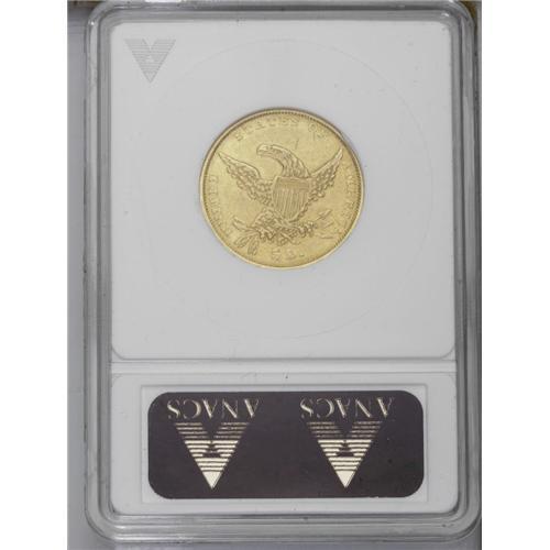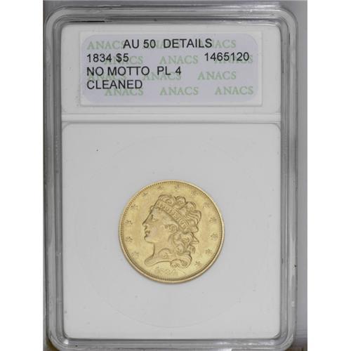 <B>1834 $5 Plain 4--Cleaned--ANACS. AU50 Details.</B></I> First Head, Breen-6501, McCloskey 3-B, R.2. Cloudy from a moderate cleaning, this greenish-gold half eagle nonetheless reveals glimpses of its original luster in recessed areas.