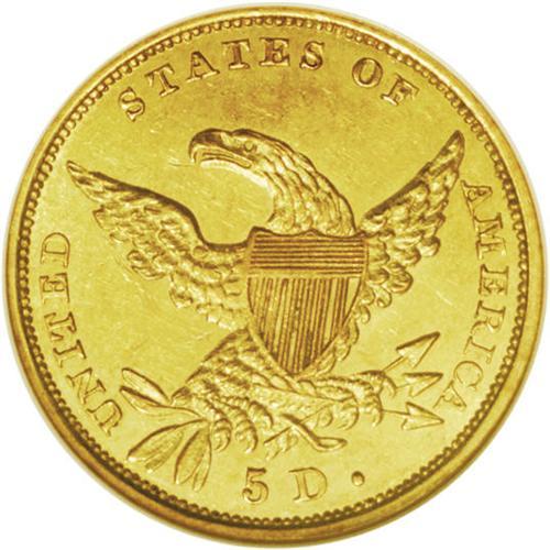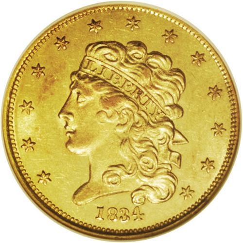 <B>1834<$5> Plain 4 MS61 NGC.</B></I> Second Head, Breen-6502, McCloskey 4-C, R.3. A well struck and flashy canary-gold piece with an occasional dash of rose on the highpoints. Ample luster brightens relatively smooth fields, since the only relevant mark is concealed just beneath the left (facing) wing. Housed in a prior generation holder.