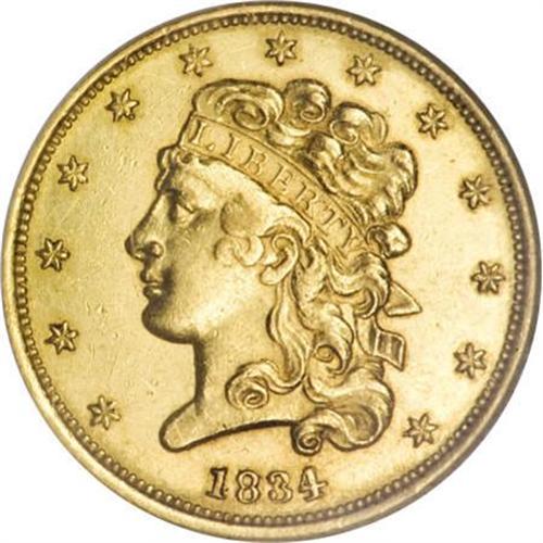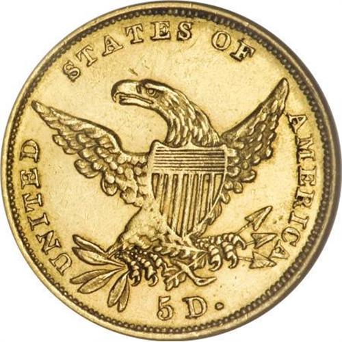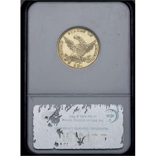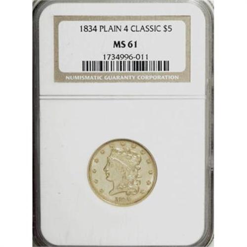 <B>1834 $5 Plain 4 MS61 NGC.</B></I> Second Head, Breen-6502, McCloskey 2-A, R.2. Lustrous and softly struck over the centers with gleaming, lime-gold surfaces that show semi-prooflike fields and scattered small disturbances across both sides. A lovely type coin and an excellent representative of the Classic Head design style. <BR><BR><B>Coin Engraver:</B> William Kneass<BR><BR><b>Shipping:</b> Coins & Currency (<a target="_blank" href="http://www.heritageauctions.com/common/shipping.php">view shipping information</a>)