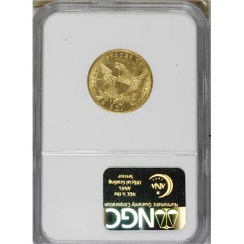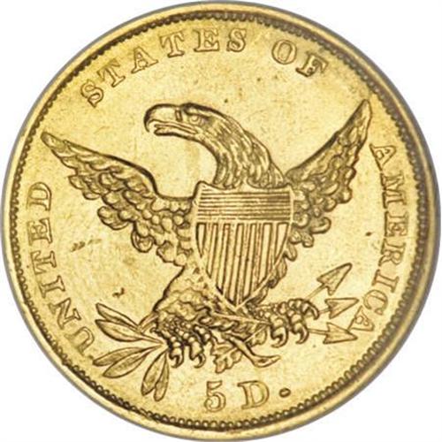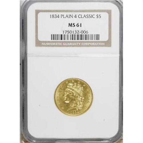 <B>1834 $5 Plain 4 MS61 NGC.</B></I> Second Head, Breen-6502, McCloskey 2-A, R.2. This first-year Classic half eagle has a generally sharp strike, despite inevitable minor weakness on the curl left of the ear and on the lower left portion of the shield. The minutely granular straw-gold surfaces lack mentionable marks.<BR><BR><B>Coin Engraver:</B> William Kneass<BR><BR><b>Shipping:</b> Coins & Currency (<a target="_blank" href="http://www.heritageauctions.com/common/shipping.php">view shipping information</a>)