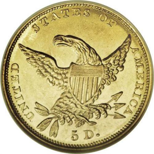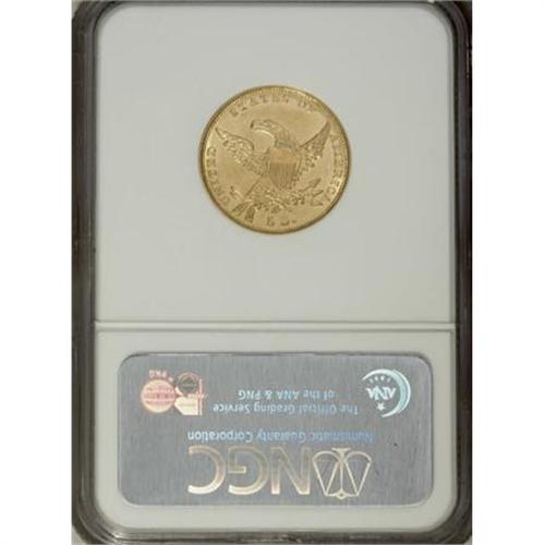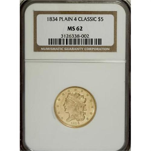 <B>1834 $5 Plain 4 MS62 NGC.</B></I> First Head, Breen-6501, McCloskey 3-B, R.2. In 1834, the weight of U.S. gold coins was reduced in order to keep them from being melted for their bullion value, and the motto E PLURIBUS UNUM was removed from the reverse. This new type was produced for five years. This green-gold example is well struck and lustrous, with just a few wispy marks on each side. <BR> <BR><BR><B>Coin Engraver:</B> William Kneass<BR><BR><b>Shipping:</b> Coins & Currency (<a target="_blank" href="http://www.heritageauctions.com/common/shipping.php">view shipping information</a>)