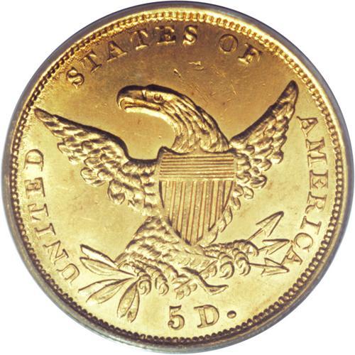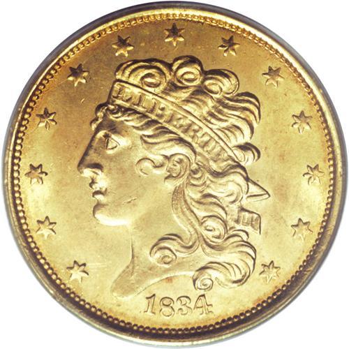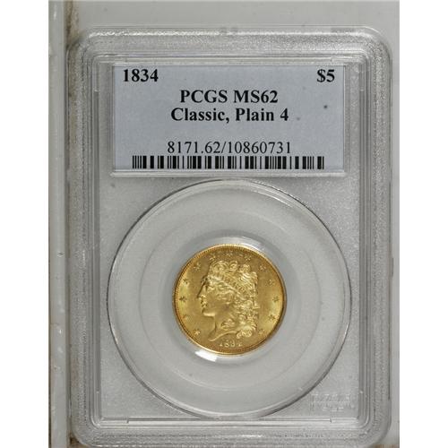 <B>1834 $5 Plain 4 MS62 PCGS.</B></I> First Head, Breen-6501, McCloskey 1-A, R.3. The radiant devices are surprisingly crisp, although a few of the stars possess soft centers. There are no marks of relevance, and luster brightens the motifs and legends. Unlike their Capped Head predecessors, the Classic types circulated extensively, and most survivors are in VF to AU grades.<BR><BR><b>Shipping:</b> Coins & Currency (<a target="_blank" href="http://www.heritageauctions.com/common/shipping.php">view shipping information</a>)