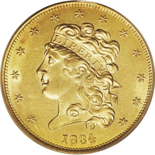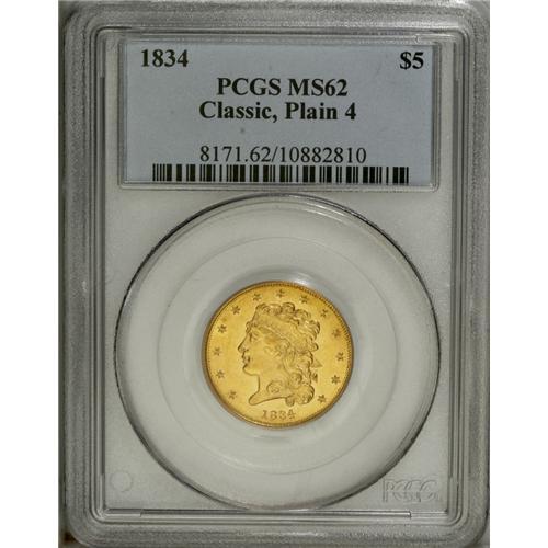 <B>1834 $5 Plain 4 MS62 PCGS.</B></I> Second Head, Breen-6502, McCloskey 2-A, R.2. A lovely lemon-gold Classic five dollar piece from the introductory year of the short-lived type. The reverse is impressively smooth, and the few minor obverse marks are relegated to the margins. The strike is good, with slight softness limited to the cheekbone curl and the left shield border.<BR><BR><b>Shipping:</b> Coin/Currency (<a target="_blank" href="http://www.heritageauctions.com/common/shipping.php">view shipping information</a>)