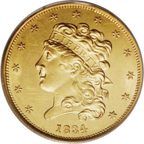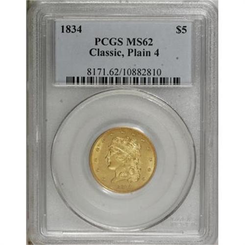 <B>1834 $5 Plain 4 MS62 PCGS.</B></I> Second Head, Breen-6502, McCloskey 2-A, R.2. A lovely lemon-gold Classic five dollar piece from the introductory year of the short-lived type. The reverse is impressively smooth, and the few minor obverse marks are relegated to the margins. The strike is good, with slight softness limited to the cheekbone curl and the left shield border.<BR><BR><b>Shipping:</b> Coins & Currency (<a target="_blank" href="http://www.heritageauctions.com/common/shipping.php">view shipping information</a>)