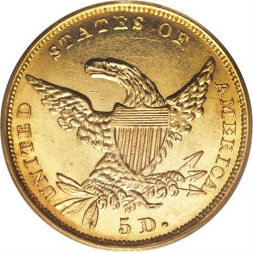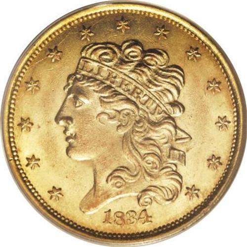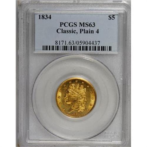 <B>1834 $5 Plain 4 MS63 PCGS.</B></I> First Head, Breen-6501, McCloskey 1-A, R.3. This beautiful gold type coin has luminous yellow surfaces with hints of rose toning on the highpoints. The strike is precise, even on the vertical shield stripes and the forehead curls. The flashy fields lack consequential contact. Although common in XF-AU, this variety is challenging to locate in such quality. Population: 51 in 63, 43 finer (8/07).<BR><BR><BR><B>Coin Engraver:</B> William Kneass<BR><BR><b>Shipping:</b> Coins & Currency (<a target="_blank" href="http://www.heritageauctions.com/common/shipping.php">view shipping information</a>)