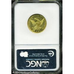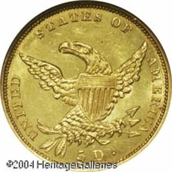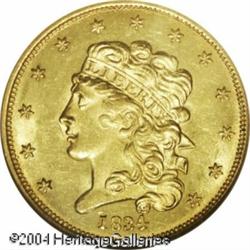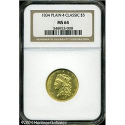 1834 $5 Plain 4 MS64 NGC. Second Head, Small Plain <B>1834 $5 Plain 4 MS64 NGC.</B></I> Second Head, Small Plain 4, Breen-6502, McCloskey 4-C, R.4. The 4 in the date touches Liberty's hair, and the 8 is the so-called "block" style. A better variety; although the obverse die is common, it is usually paired with McCloskey's A or B reverse. This well struck example has original honey-gold color over semi-reflective surfaces, and is clean for the grade. A shallow pinscratch above the eagle's beak performs duty as a pedigree marker. <BR><BR><B>Important notice:</B> Heritage usually auctions material at the rate of 200-250 lots per hour. On some occasions eBay Live bid software or the Internet may not be able to keep up with the pace of the auction. We recommend placing a realistic absentee bid now as insurance to avoid disappointment. Occasionally the auctioneer may eliminate or reject an eBay Live bid, and the auctioneer may also reopen a lot after the close of the eBay live bidding (usually because we missed an audience bid), and may reject your bid even if it shows you as the winning bidder. By bidding via eBay Live, you agree that Heritage may award the lot to another bidder at its sole discretion under the circumstances described above or any other reasonable circumstances. Since eBay bids are not shown to us until we open the lot on the floor, we treat those bids just like floor bids. In most cases the floor responds before the eBay bid is presented to us, due to Internet lag time, so for consistency we have made it a policy that floor bids are always considered first over tie eBay live bids. Also please note that all Heritage lots purchased through eBay Live carry a 20% Buyer's Premium. Please make sure you read the Terms and Conditions before you bid. This lot is being auctioned in conjunction with a live floor auction by Heritage Galleries & Auctioneers. All final auction and invoice information will be supplied by Heritage Galleries & Auctioneers, and all other information should be considered preliminary. Lot:6631