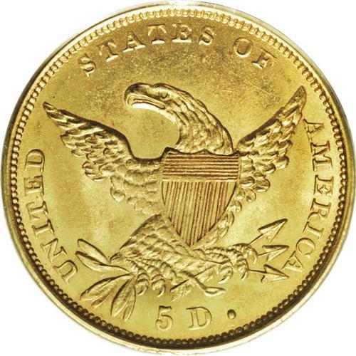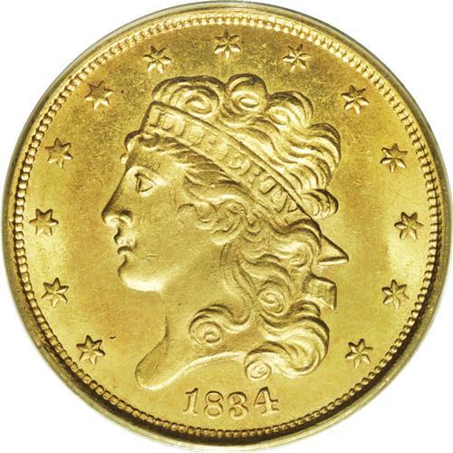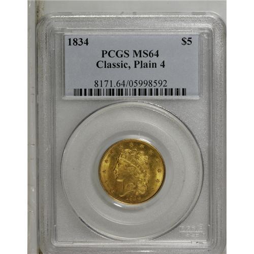 <B>1834 $5 Plain 4 MS64 PCGS.</B></I> First Head, Breen-6501, McCloskey 3-C, R.5. A gorgeous pumpkin-gold and sea-green near-Gem with a remarkably smooth obverse. The reverse is nearly as clean, and has only a couple of unimportant grazes. The area near the BER in LIBERTY is incompletely brought up, but the strike is nonetheless better than often seen. At the moment, Classic Half Eagles are not widely collected by die marriage, even though the dies were formed by many individual punches similar to the Half Dollars of the era. This may change in the future, once a quality reference becomes available, and rare die marriages may become eagerly contested.<BR><BR><b>Shipping:</b> Coin/Currency (<a target="_blank" href="http://www.heritageauctions.com/common/shipping.php">view shipping information</a>)