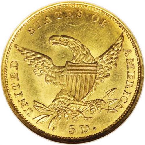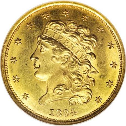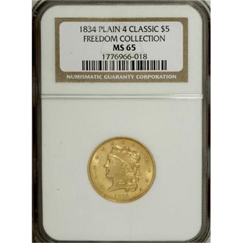<B>1834 $5 Plain 4 MS65 NGC.</B></I> Ex: Freedom Collection. Second Head, Breen-6502, McCloskey 2-A. The Classic Head fives are the creation of William Kneass, who replaced Robert Scot as chief engraver a decade earlier. This design provided a ready visual aid for coins of the new weight standard, lowered from the earlier coinage to promote actual circulation. Kneass was born in Lancaster, Pennsylvania in 1781 and worked as a plate engraver for books prior to his appointment to the Mint engraving department. Due to the weight reduction, large quantities of Classic Head coins were produced, both quarter eagles and half eagles. Gold for this production came primarily from the Southeast, but also from Europe. There are nine known varieties of 1834 Classic Head half eagles, and McCloskey 2-A is one of the common varieties. The obverse is quickly identified by the tripled top to the 4 in the date. The eagle has a tongue and the digit 5 is centered beneath the arrow feather. Although this variety is common, the quality of this example is infrequently seen. In fact, NGC has certified just eight 1834 Classic Head half eagles at this grade level, with none finer, and that census includes all different varieties. This lovely olive-gold example has satiny or soft, frosty luster with slight reflectivity in the fields. Each side is a trifle weak at the center, with all surrounding design details boldly defined.<BR> A few die cracks are evident, especially on the reverse. A faint crack joins the bases of TED, thickening below the D and gives that letter a doubled appearance at the bottom. Another faint crack joins TES and a third connects the right wing tip to the border.<BR><I>From The Belle Glade Collection, Part Two.</B></I><BR><BR><B>Coin Engraver:</B> William Kneass<BR><BR><b>Shipping:</b> Coins & Currency (<a target="_blank" href="http://www.heritageauctions.com/common/shipping.php">view shipping information</a>\)