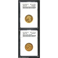 1834 $5 Plain 4--Rim Filed, Tooled--ANACS, XF Details, Net VF20, both sides exhibit olive-gold color with scattered abrasions and smoothed over fields; and an 1834 Plain 4--Cleaned--ANACS, XF Details, Net VF30, the somewhat scuffy surfaces are yellow-gold in color and bright.<p>2 coins Important notice: We expect to be auctioning lots at the rate of 200-250 per hour. Sometimes eBay Premier live bid software cannot keep up with that pace, so we strongly recommend that you place a realistic proxy bid now as insurance to avoid disappointment. Also please note that all Heritage/CAA lots purchased through eBay Premier carry a 20% Buyer's Premium.