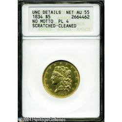 1834 $5 Plain 4--Scratched, Cleaned--ANACS. Unc Deta <B>1834 $5 Plain 4--Scratched, Cleaned--ANACS. Unc Details, Net AU55.</B></I> First Head, Breen-6501, McCloskey 3-B, R.2. The strike is unusually bold on this first year Classic Half Eagle, which features honey-gold color and an attractive appearance to the naked eye. Lightly cleaned, but otherwise unmarked aside from a hook-shaped pinscratch below OF. <BR><BR><B>Important notice:</B> Heritage usually auctions material at the rate of 200-250 lots per hour. On some occasions eBay Live bid software or the Internet may not be able to keep up with the pace of the auction. We recommend placing a realistic absentee bid now as insurance to avoid disappointment. Occasionally the auctioneer may eliminate or reject an eBay Live bid, and the auctioneer may also reopen a lot after the close of the eBay live bidding (usually because we missed an audience bid), and may reject your bid even if it shows you as the winning bidder. By bidding via eBay Live, you agree that Heritage may award the lot to another bidder at its sole discretion under the circumstances described above or any other reasonable circumstances. Since eBay bids are not shown to us until we open the lot on the floor, we treat those bids just like floor bids. In most cases the floor responds before the eBay bid is presented to us, due to Internet lag time, so for consistency we have made it a policy that floor bids are always considered first over tie eBay live bids. Also please note that all Heritage lots purchased through eBay Live carry a 20% Buyer's Premium. Please make sure you read the Terms and Conditions before you bid. This lot is being auctioned in conjunction with a live floor auction by Heritage Galleries & Auctioneers. All final auction and invoice information will be supplied by Heritage Galleries & Auctioneers, and all other information should be considered preliminary. Lot:6629