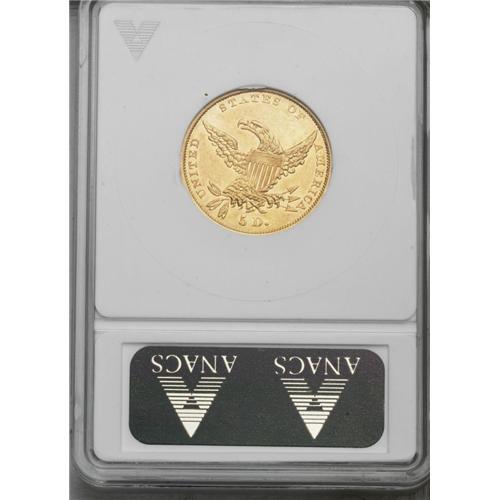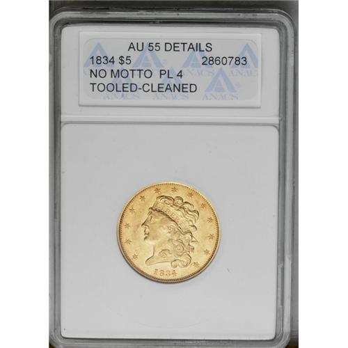 <B>1834<$5> Plain 4--Tooled, Cleaned--ANACS. AU55 Details.</B></I> Second Head, Breen-6502, McCloskey 2-B, R.3. The upper reverse field is tooled with myriad pinscratches, and a couple of lesser pinscratches are noted near the first star. The orange-red surfaces are slightly bright from a long-ago cleaning.