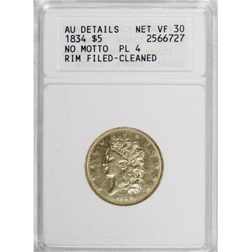<B>1834 $5 Plain 4--Cleaned, Rim Filed--ANACS. AU Details, Net VF30.</B></I> NGC Census: (22/1547). PCGS Population (36/909). Mintage: 657,460. Numismedia Wsl. Price for NGC/PCGS coin in VF30: $592. (#8171)<BR><BR><B>Coin Engraver:</B> William Kneass<BR><BR><b>Shipping:</b> Coins & Currency (<a target="_blank" href="http://www.heritageauctions.com/common/shipping.php">view shipping information</a>)