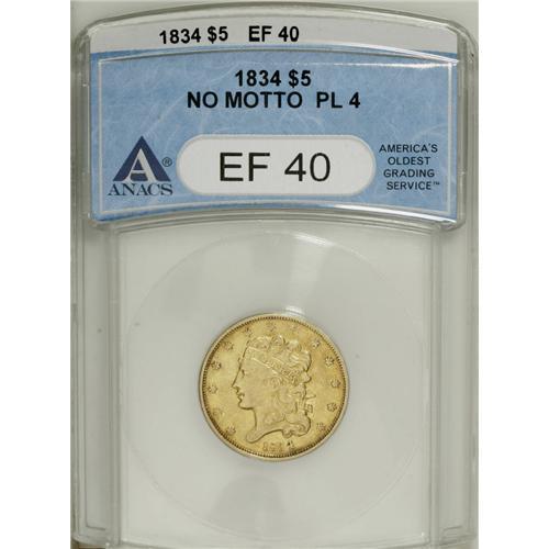 <B>1834 $5 Plain 4 XF40 ANACS.</B></I> Breen-6501, McCloskey 3-C, R.5. Light wear concentrated at the highpoints of this yellow-gold half eagle has left parts of the periphery with intact luster. Well struck with a copper spot in the hollow of the 4 in the date.<BR><BR><b>Shipping:</b> Coin/Currency (<a target="_blank" href="http://www.heritageauctions.com/common/shipping.php">view shipping information</a>)
