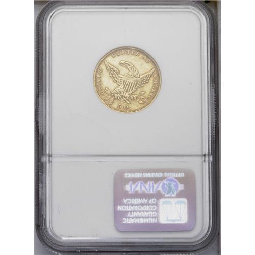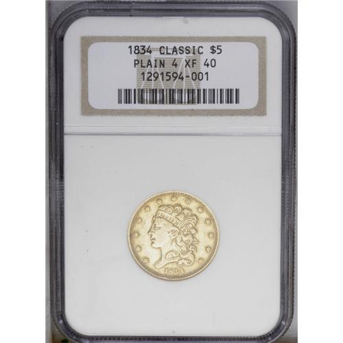 <B>1834<$5> Plain 4 XF40 NGC.</B></I> First Head, Breen-6501, McCloskey 3-B, R.2. This deep yellow-gold introductory-year type coin is slightly bright but displays ample golden-brown luster. Wear is concentrated near Liberty's forehead. <BR><BR><B>Important notice:</B> Heritage usually auctions material at the rate of 200-250 lots per hour. On some occasions eBay Live bid software or the Internet may not be able to keep up with the pace of the auction. We recommend placing a realistic absentee bid now as insurance to avoid disappointment. Occasionally the auctioneer may eliminate or reject an eBay Live bid, and the auctioneer may also reopen a lot after the close of the eBay live bidding (usually because we missed an audience bid), and may reject your bid even if it shows you as the winning bidder. By bidding via eBay Live, you agree that Heritage may award the lot to another bidder at its sole discretion under the circumstances described above or any other reasonable circumstances. Since eBay bids are not shown to us until we open the lot on the floor, we treat those bids just like floor bids. In most cases the floor responds before the eBay bid is presented to us, due to Internet lag time, so for consistency we have made it a policy that floor bids are always considered first over tie eBay live bids. Also please note that all Heritage lots purchased through eBay Live carry a 20% Buyer's Premium. Please make sure you read the Terms and Conditions before you bid. This lot is being auctioned in conjunction with a live floor auction by Heritage Galleries & Auctioneers. All final auction and invoice information will be supplied by Heritage Galleries & Auctioneers, and all other information should be considered preliminary. Lot:2636 <BR><BR><B>Winning Notification and Billing:</B> After the FINAL session in this auction is complete, Heritage will send e-mail and snail mail invoices. This process normally takes several days. All final auction and invoice information will be supplied by Heritage Galleries & Auctioneers, and all other information should be considered preliminary. <BR><BR>This auction will be conducted on a live auction floor and over the Internet through eBay Live. If you choose to place an absentee bid, please take a moment to <font color='#0000ff'><u><a href='http://pages.ebay.com/liveauctions/help/before/laabsentee.html'>learn how eBay Live absentee bidding works</a></u></font><font color='#000000'>