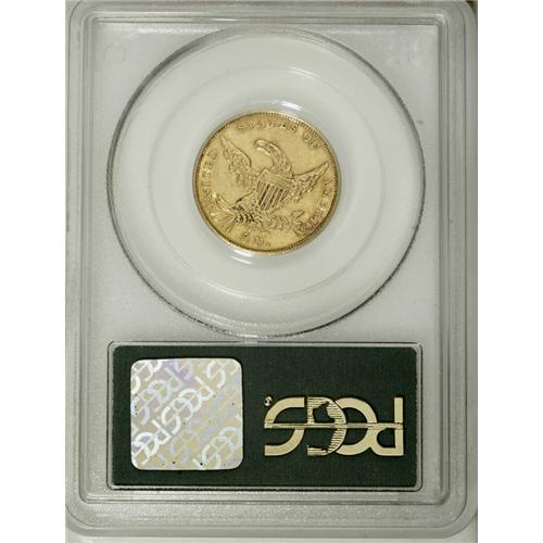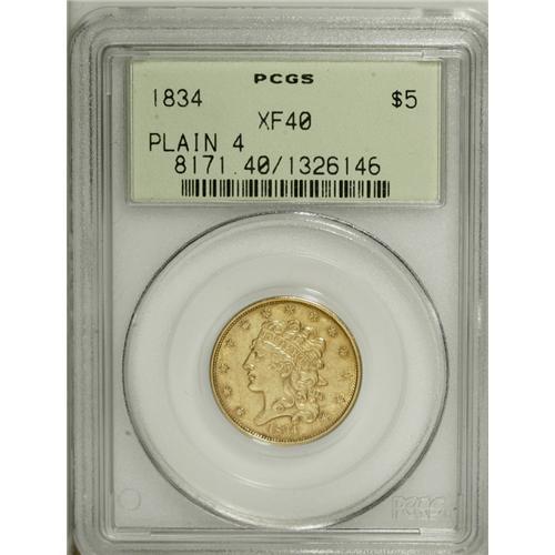 <B>1834 $5 Plain 4 XF40 PCGS.</B></I> First Head, Breen-6501, McCloskey 1-A, R.3. Unexpectedly bold for the XF level, and pockets of luster accompany protected areas. Speckles of dark debris are noted on the shield and left (facing) claw. Encased in an old green label holder.<BR><BR><b>Shipping:</b> Coins & Currency (<a target="_blank" href="http://www.heritageauctions.com/common/shipping.php">view shipping information</a>)