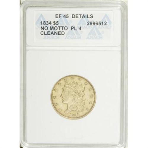 <B>1834 $5 Plain 4--Cleaned--ANACS. XF45 Details.</B></I> NGC Census: (179/1127). PCGS Population (170/525). Mintage: 657,460. Numismedia Wsl. Price for NGC/PCGS coin in XF45: $982. (#8171)<BR><BR><B>Coin Engraver:</B> William Kneass<BR><BR><b>Shipping:</b> Coins & Currency (<a target="_blank" href="http://www.heritageauctions.com/common/shipping.php">view shipping information</a>\)