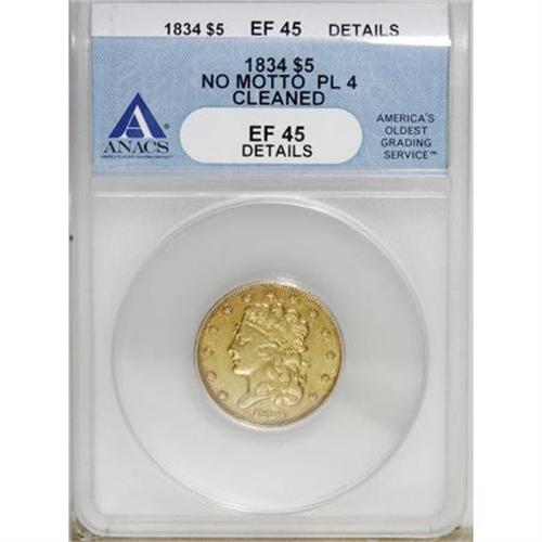 <B>1834 $5 Plain 4--Cleaned--ANACS. XF45 Details.</B></I> NGC Census: (190/1183). PCGS Population (173/539). Mintage: 657,460. Numismedia Wsl. Price for NGC/PCGS coin in XF45: $991. (#8171)<BR><BR><B>Coin Engraver:</B> William Kneass<BR><BR><b>Shipping:</b> Coins & Currency (<a target="_blank" href="http://www.heritageauctions.com/common/shipping.php">view shipping information</a>)