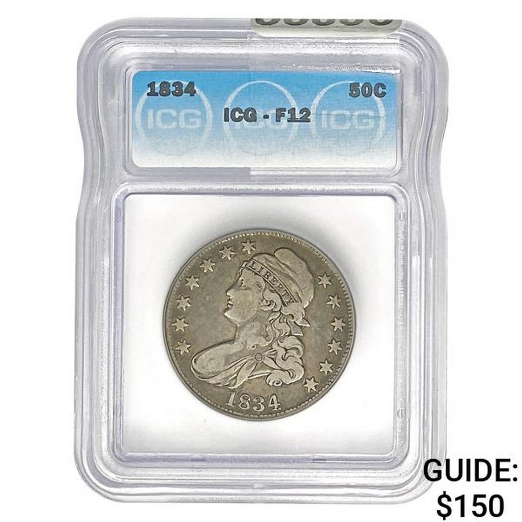 1834 50C Capped Bust Half Dollar ICG F12