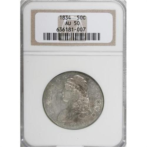 <B>1834 50C Large Date, Large Letters AU50 NGC.</B></I> NGC Census: (102/1274). PCGS Population (112/589). Mintage: 6,412,004. Numismedia Wsl. Price for NGC/PCGS coin in AU50: $325. (#6164)<BR><BR><B>Coin Engraver:</B> John Reich<BR><BR><b>Shipping:</b> Coins & Currency (<a target="_blank" href="http://www.heritageauctions.com/common/shipping.php">view shipping information</a>)