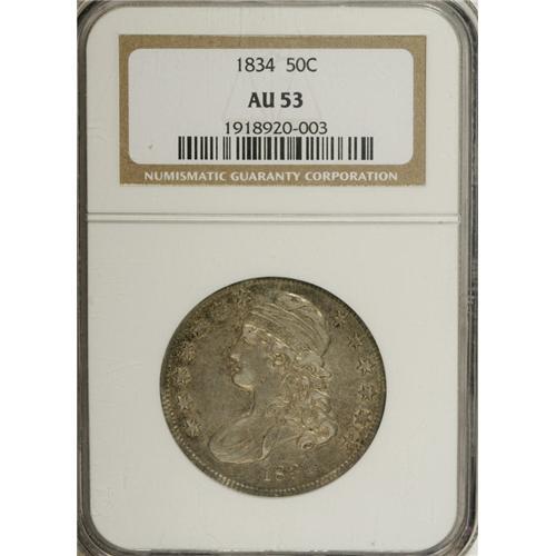 <B>1834 50C Large Date, Large Letters AU53 NGC.</B></I> NGC Census: (94/1108). PCGS Population (57/524). Mintage: 6,412,004. Numismedia Wsl. Price for NGC/PCGS coin in AU53: $233. (#6164)<BR><BR><b>Shipping:</b> Coins & Currency (<a target="_blank" href="http://www.heritageauctions.com/common/shipping.php">view shipping information</a>)