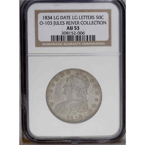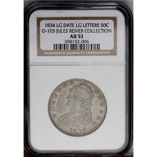 1834 50C Large Date, Large Letters AU53 NGC. O-103, R. 1834[50C] Large Date, Large Letters AU53 NGC.