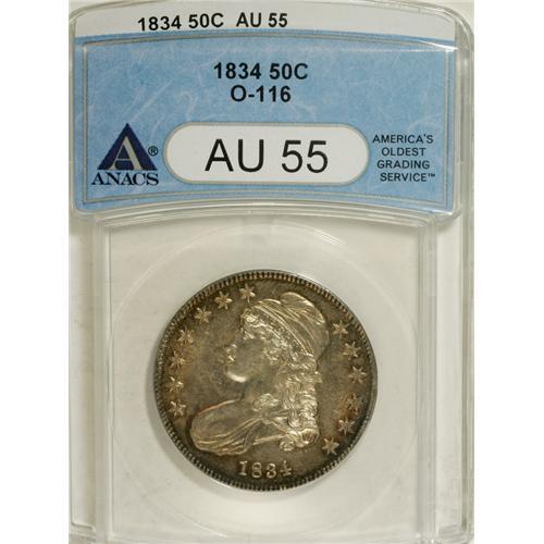 <B>1834 50C Large Date, Large Letters AU55 ANACS.</B></I> O-116. NGC Census: (177/931). PCGS Population (149/375). Mintage: 6,412,004. Numismedia Wsl. Price for NGC/PCGS coin in AU55: $283. (#6164)<BR><BR><b>Shipping:</b> Coins & Currency (<a target="_blank" href="http://www.heritageauctions.com/common/shipping.php">view shipping information</a>)