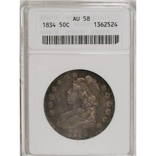 <B>1834 50C Large Date, Large Letters AU58 ANACS.</B></I> NGC Census: (401/571). PCGS Population (112/268). Mintage: 6,412,004. Numismedia Wsl. Price for NGC/PCGS coin in AU58: $585. (#6164)<BR><BR><B>Coin Engraver:</B> John Reich<BR><BR><b>Shipping:</b> Coins & Currency (<a target="_blank" href="http://www.heritageauctions.com/common/shipping.php">view shipping information</a>)