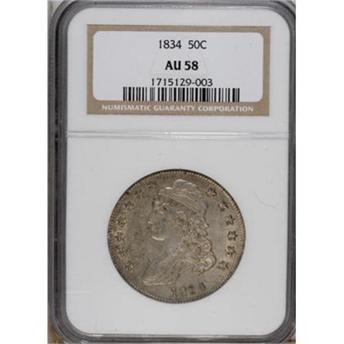 <B>1834 50C Large Date, Large Letters AU58 NGC.</B></I> NGC Census: (386/548). PCGS Population (107/268). Mintage: 6,412,004. Numismedia Wsl. Price for NGC/PCGS coin in AU58: $600. (#6164)<BR><BR><b>Shipping:</b> Coins & Currency (<a target="_blank" href="http://www.heritageauctions.com/common/shipping.php">view shipping information</a>)
