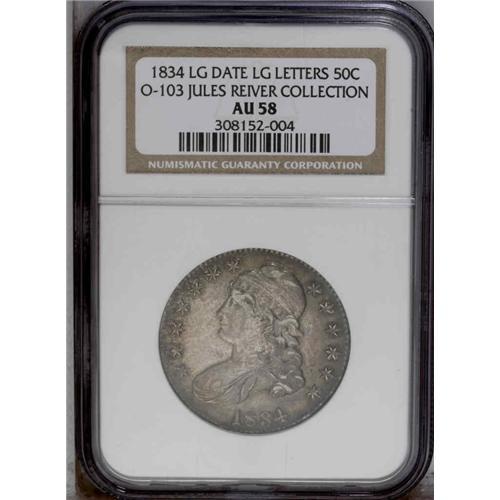 1834 50C Large Date, Large Letters AU58 NGC. O-103, R. 1834[50C] Large Date, Large Letters AU58 NGC.