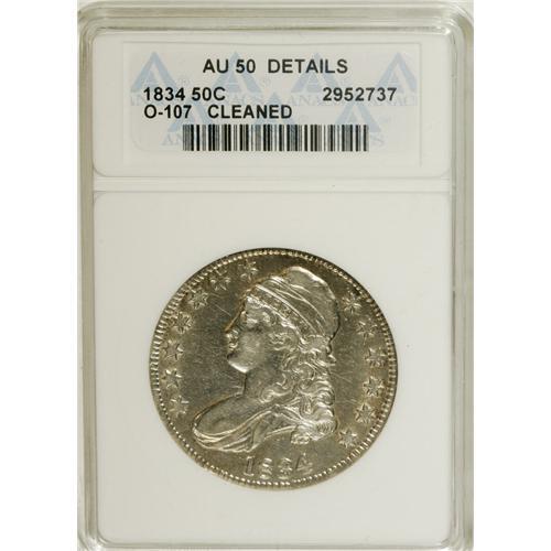 <B>1834 50C Large Date, Small Letters--Cleaned--ANACS. AU50 Details.</B></I> O-107, R.1. PCGS Population (17/147). Mintage: 6,412,004. Numismedia Wsl. Price: $221. (#6165)<BR><BR><b>Shipping:</b> Coins & Currency (<a target="_blank" href="http://www.heritageauctions.com/common/shipping.php">view shipping information</a>)
