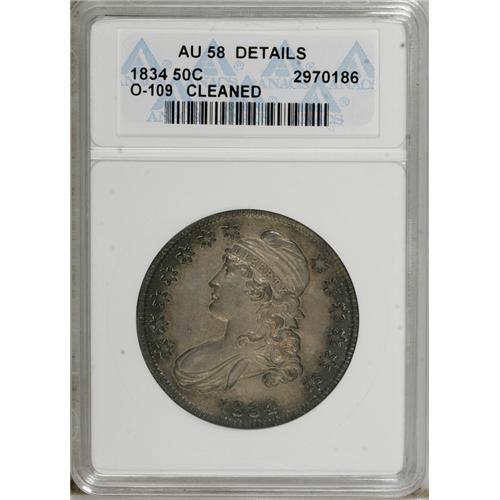 <B>1834 50C Large Date, Large Letters--Cleaned--ANACS. AU58 Details.</B></I> O-109. NGC Census: (770/1094). PCGS Population (107/268). Mintage: 6,412,004. Numismedia Wsl. Price for NGC/PCGS coin in AU58: $600. (#6164)<BR><BR><b>Shipping:</b> Coins & Currency (<a target="_blank" href="http://www.heritageauctions.com/common/shipping.php">view shipping information</a>)