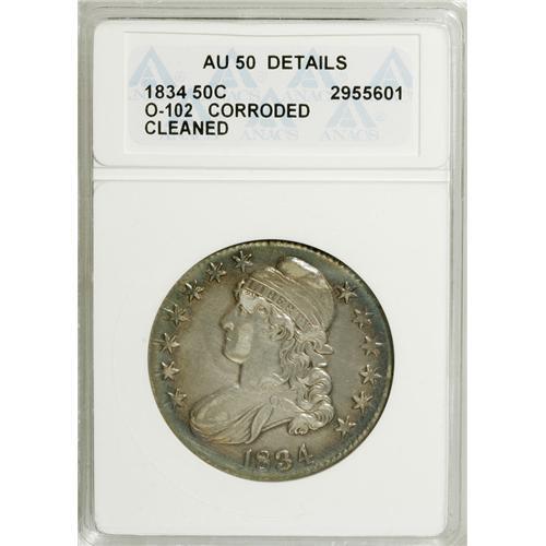 <B>1834 50C Large Date, Large Letters--Cleaned, Corroded--ANACS. AU50 Details.</B></I> O-102. NGC Census: (95/1193). PCGS Population (111/579). Mintage: 6,412,004. Numismedia Wsl. Price: $221. (#6164)<BR><BR><b>Shipping:</b> Coins & Currency (<a target="_blank" href="http://www.heritageauctions.com/common/shipping.php">view shipping information</a>)