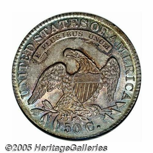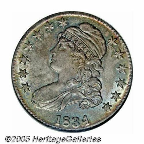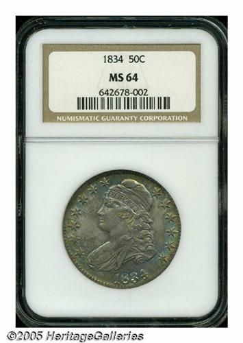 <B>1834<50C> Large Date, Large Letters MS64 NGC.</B></I> O-101, R.1. Lavender, ocean-blue, and gold colors illuminate this meticulously struck representative. Substantial bright luster percolates beneath the scintillating patina. Faint marks on the chin, neck and on the field above the eagle are mentioned for accuracy. Examples with the eye appeal of the present coin are always in demand in the marketplace.