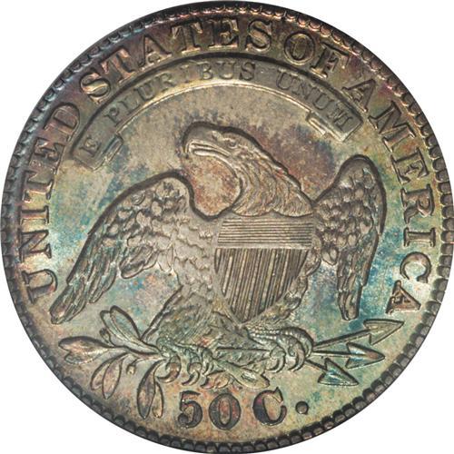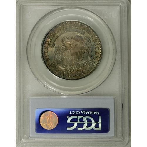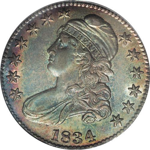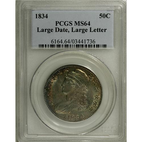 <B>1834 50C Large Date, Large Letters MS64 PCGS.</B></I> O-101, R.1. Rose-red, blue-green, and gold dominate this shimmering and unblemished Capped Bust half. The portrait highpoints are lilac-gray. A colorful contribution to the advanced early silver cabinet. Population: 54 in 64, 15 finer (11/06).<BR><BR><b>Shipping:</b> Coin/Currency (<a target="_blank" href="http://www.heritageauctions.com/common/shipping.php">view shipping information</a>)