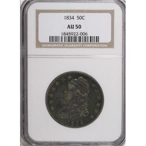 <B>1834 50C Large Date, Small Letters AU50 NGC. O-107, R.1. </B></I>Mintage: 6,412,004. Numismedia Wsl. Price for NGC/PCGS coin in AU50: $225. (#6165)<BR><BR><B>Coin Engraver:</B> John Reich<BR><BR><b>Shipping:</b> Coins & Currency (<a target="_blank" href="http://www.heritageauctions.com/common/shipping.php">view shipping information</a>)