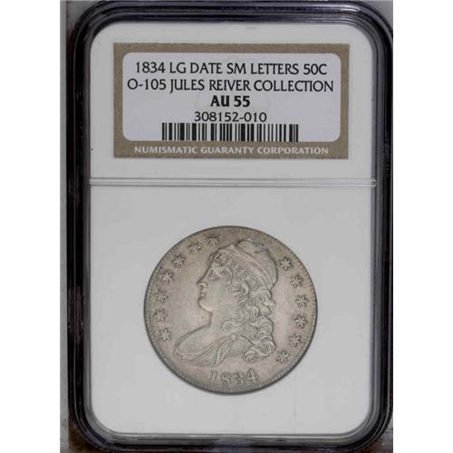 1834 50C Large Date, Small Letters AU55 NGC. O-105, R. 1834[50C] Large Date, Small Letters AU55 NGC.