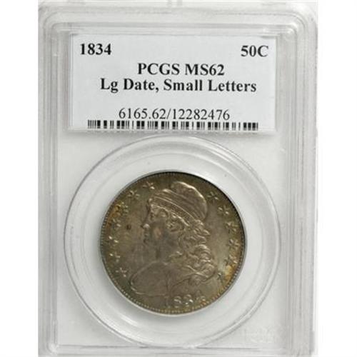 <B>1834 50C Large Date, Small Letters MS62 PCGS.</B></I> O-104, R.2. Golden-tan and orange shadings appear at the margins, while the centers are slate-blue with elements of champagne and violet. Elegant eye appeal. Population: 12 in 62, 59 finer (12/07).<BR><BR><B>Coin Engraver:</B> John Reich<BR><BR><b>Shipping:</b> Coins & Currency (<a target="_blank" href="http://www.heritageauctions.com/common/shipping.php">view shipping information</a>)
