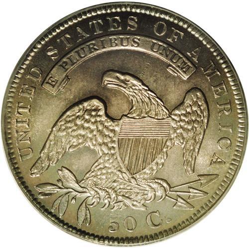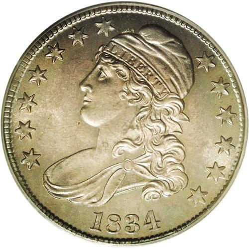 <B>1834<50C> Large Date, Small Letters MS64 PCGS.</B></I> O-108, R.2. On this die marriage, several of the horizontal shield lines extend outside of the shield on both sides. Liberty's slightly open mouth has a full, curved lower lip. This lovely specimen shows pastel rose and blue toning over well struck surfaces. A single dark patch is noted in front of Liberty's curls on the upper neck. There are few abrasions noted, even under a loupe. Population: 24 in 64, 10 finer (3/06). <BR><BR><B>Important notice:</B> Heritage usually auctions material at the rate of 200-250 lots per hour. On some occasions eBay Live bid software or the Internet may not be able to keep up with the pace of the auction. We recommend placing a realistic absentee bid now as insurance to avoid disappointment. Occasionally the auctioneer may eliminate or reject an eBay Live bid, and the auctioneer may also reopen a lot after the close of the eBay live bidding (usually because we missed an audience bid), and may reject your bid even if it shows you as the winning bidder. By bidding via eBay Live, you agree that Heritage may award the lot to another bidder at its sole discretion under the circumstances described above or any other reasonable circumstances. Since eBay bids are not shown to us until we open the lot on the floor, we treat those bids just like floor bids. In most cases the floor responds before the eBay bid is presented to us, due to Internet lag time, so for consistency we have made it a policy that floor bids are always considered first over tie eBay live bids. Also please note that all Heritage lots purchased through eBay Live carry a 20% Buyer's Premium. Please make sure you read the Terms and Conditions before you bid. This lot is being auctioned in conjunction with a live floor auction by Heritage Galleries & Auctioneers. All final auction and invoice information will be supplied by Heritage Galleries & Auctioneers, and all other information should be considered preliminary. Lot:1970 <BR><BR><B>Winning Notification and Billing:</B> After the FINAL session in this auction is complete, Heritage will send e-mail and snail mail invoices. This process normally takes several days. All final auction and invoice information will be supplied by Heritage Galleries & Auctioneers, and all other information should be considered preliminary. <BR><BR>This auction will be conducted on a live auction floor and over the Internet through eBay Live. If you choose to place an absentee bid, please take a moment to <font color='#0000ff'><u><a href='http://pages.ebay.com/liveauctions/help/before/laabsentee.html'>learn how eBay Live absentee bidding works</a></u></font><font color='#000000'>