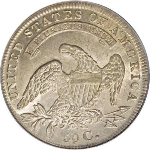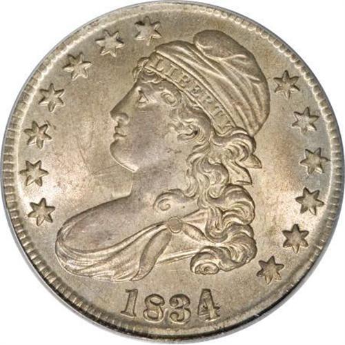 <B>1834 50C Large Date, Small Letters MS64 PCGS.</B></I> O-106, R.1. Glenn Peterson's Large 4 over Small 4 variety, which can also be identified by the curved left upright of the M in AMERICA. This caramel-gold example has unbroken luster across the fields, and the strike is good despite softness on the star centers and the left (facing) wing joint.<BR><BR><B>Coin Engraver:</B> John Reich<BR><BR><b>Shipping:</b> Coins & Currency (<a target="_blank" href="http://www.heritageauctions.com/common/shipping.php">view shipping information</a>)