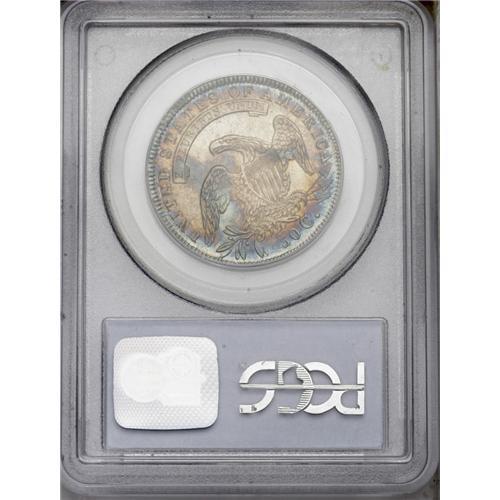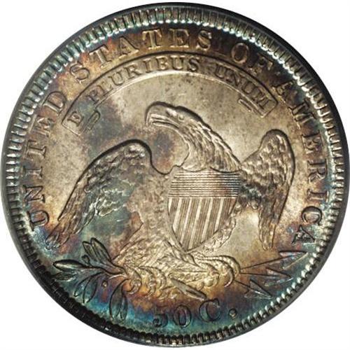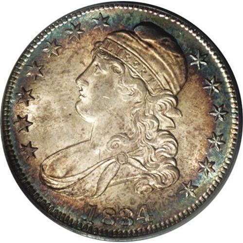 <B>1834<50C> Large Date, Small Letters MS65 PCGS.</B></I> O-105, R.1. Golden-brown centers are bounded by aqua-blue toning. A couple of left side stars are soft, as is the left (facing) wing near the shield, but the remainder of the design is boldly impressed. This beautiful and lustrous Gem is completely problem-free, and would improve even the advanced specialized Bust collection.