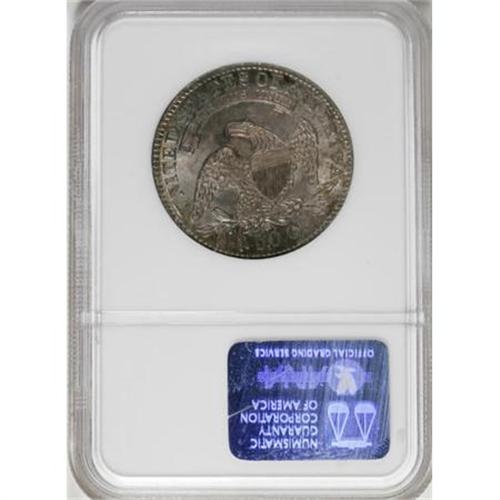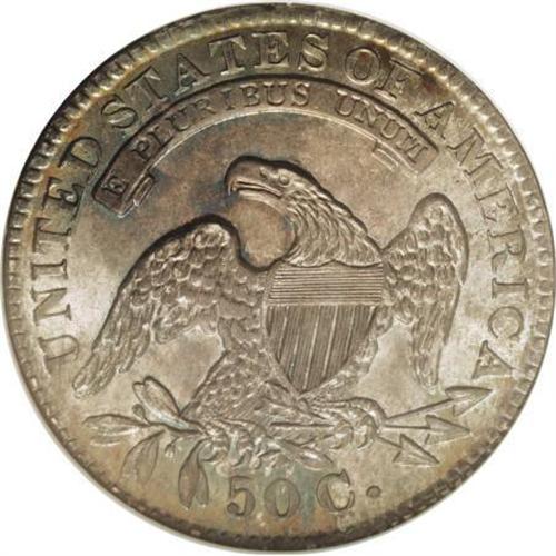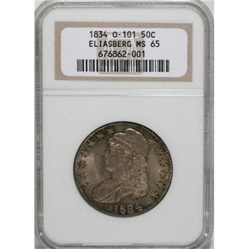 <B>1834 50C Large Date, Large Letters MS65 NGC.</B></I> Ex: Eliasberg. O-101, R.1. This lustrous piece is luxuriously toned in lavender, fire-red, and aquamarine shades. The strike is bold aside from the centers of the first four stars. A hair-thin mark crosses the nose, but marks are otherwise absent. Within the (8/07) NGC Census for O-101, the present is the single finest graded, and its closest competitors are four grades back at MS61.<BR><I>Ex: Louis E. Eliasberg, Sr. Collection (Bowers and Merena, 4/07), lot 1888.</B></I><BR><BR><B>Coin Engraver:</B> John Reich<BR><BR><b>Shipping:</b> Coins & Currency (<a target="_blank" href="http://www.heritageauctions.com/common/shipping.php">view shipping information</a>)