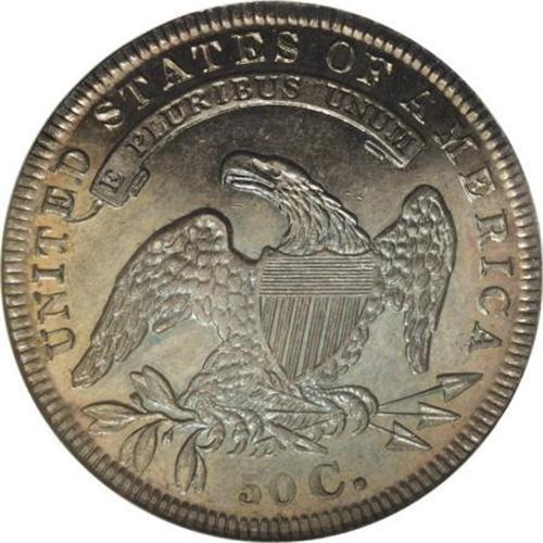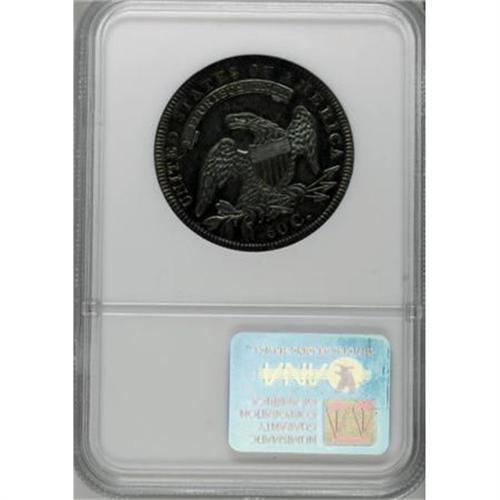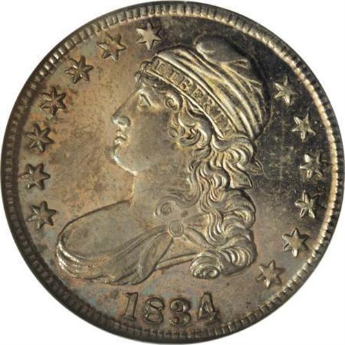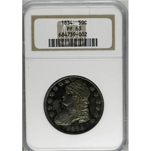 <B>1834 50C PR63 NGC.</B></I> O-106, R.8 as a proof. Only a few proof 1834 half dollars are known, mostly from the dies used to produce the Crushed Lettered Edge (CLE) restrikes. In the catalog of the George Byers collection, where this coin was last offered, Stack's included a listing of 10 proof 1834 half dollars, enumerating five proof strikes from five different pairs of dies also used for business strikes (thus unique in each case), as well as five other proofs that are all CLE pieces from dies that were not used for any business strikes. Although the possible existence of a few other proofs from the business strike dies must be acknowledged, we still conclude that any such proof is actually rarer than the CLE proofs.<BR> This piece is deeply toned over fully mirrored fields with light cameo contrast. There are a few small planchet flakes and other insignificant blemishes on each side. The only pedigree marker is a short scratch from the left ribbon end to the bottom of E in UNITED. Certified population data is not meaningful for these early proofs as it does not always record data by individual varieties.<BR><I>Ex: Jascha Heifetz Collection (Superior, 10/1989), lot 831; Remick Collection (Stack's, 9/1997), lot 829; Rarities Sale (Bowers and Merena, 1/2000), lot 169; George Byers Collection (Stack's, 10/2006), lot 1084.</B></I><BR><BR><B>Coin Engraver:</B> John Reich<BR><BR><b>Shipping:</b> Coins & Currency (<a target="_blank" href="http://www.heritageauctions.com/common/shipping.php">view shipping information</a>\)