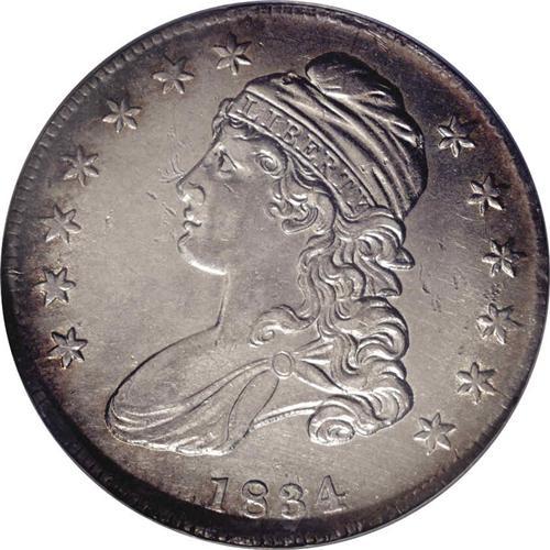 <B>1834<50C> Small Date, Small Letters AU50--Improperly Cleaned--NCS. AU Details.</B></I> O-117, R.2. This coin exhibits overly bright, glossy surfaces from cleaning. There is a touch of grade-consistent rub, and examination with a loupe reveals numerous small digs and nicks. A small hole near the front of Liberty's cap, was probably created from extraneous material on the obverse die during minting. Envelope Included.