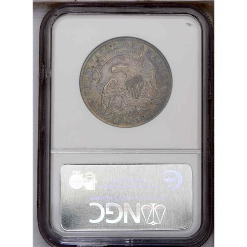 <B>1834<50C> Small Date, Small Letters AU50 NGC.</B></I> O-121, R.3. The present coin has a darkly toned mix of silver, indigo, and aqua, with a crescent of sunset-orange behind Liberty. Subdued mint luster radiates through the toning. Other than grade-consistent wear, perusal with a glass reveals no notable distractions. Envelope Included.