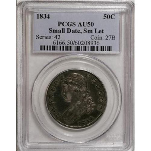 <B>1834 50C Small Date, Small Letters AU50 PCGS.</B></I> . PCGS Population (41/261). NGC Census: (0/0). (#6166)<BR><BR><B>Coin Engraver:</B> John Reich<BR><BR><b>Shipping:</b> Coins & Currency (<a target="_blank" href="http://www.heritageauctions.com/common/shipping.php">view shipping information</a>)