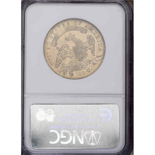 <B>1834<50C> Small Date, Small Letters AU53 NGC.</B></I> O-113, R.1. The O-113 has a double outline to the gown clasp, with distinctive die lines beneath. On the reverse, the original E has been eradicated and repunched further left, leaving a shadow of the original. This lustrous, lightly toned coin shows a somewhat soft strike and light field chatter, but examination under a glass shows few mentionable distractions. Envelope Included.