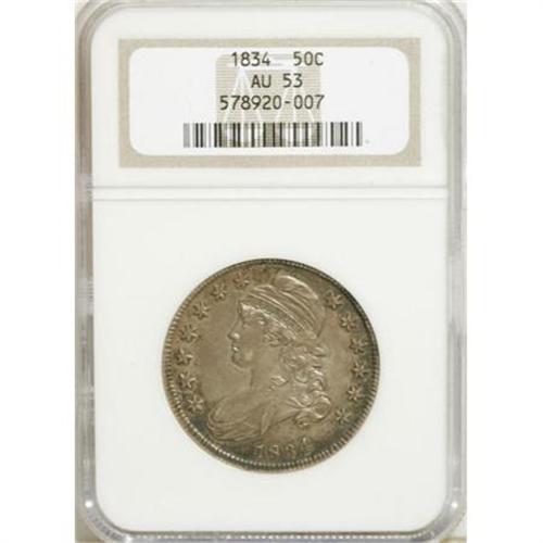 <B>1834 50C Small Date, Small Letters AU53 NGC.</B></I> NGC Census: 0 in 53, 0 finer (10/07). PCGS Population: 34 in 53, 214 finer (10/07).Mintage: 6,412,004. (#6166)<BR><BR><B>Coin Engraver:</B> John Reich<BR><BR><b>Shipping:</b> Coins & Currency (<a target="_blank" href="http://www.heritageauctions.com/common/shipping.php">view shipping information</a>)