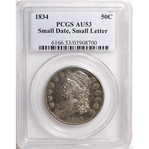 <B>1834 50C Small Date, Small Letters AU53 PCGS.</B></I> O-109, R.1. PCGS Population (34/218). NGC Census: (0/0). (#6166)<BR><BR><B>Coin Engraver:</B> John Reich<BR><BR><b>Shipping:</b> Coins & Currency (<a target="_blank" href="http://www.heritageauctions.com/common/shipping.php">view shipping information</a>)